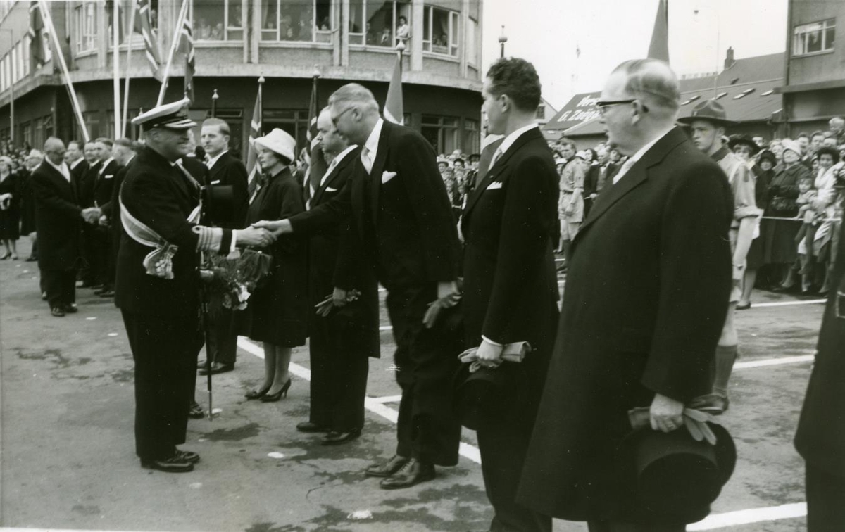 Ólafi V. Noregskonungi vel fagnað við komuna til landsins. Ráðherrar, borgarstjóri Reykjavíkur og embættismenn heilsa Ólafi V. við komuna til landsins.