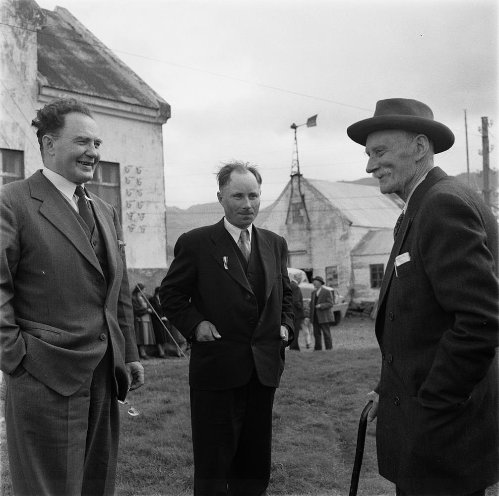Hólar. Hornafjörður. Þrír jakkafataklæddir menn á bæjarhlaði, sér í hús og vindrafstöð. Hermann Jónasson forsætisráðherra, Páll Þorsteinsson alþingismaður og Þorleifur Jónsson bóndi.