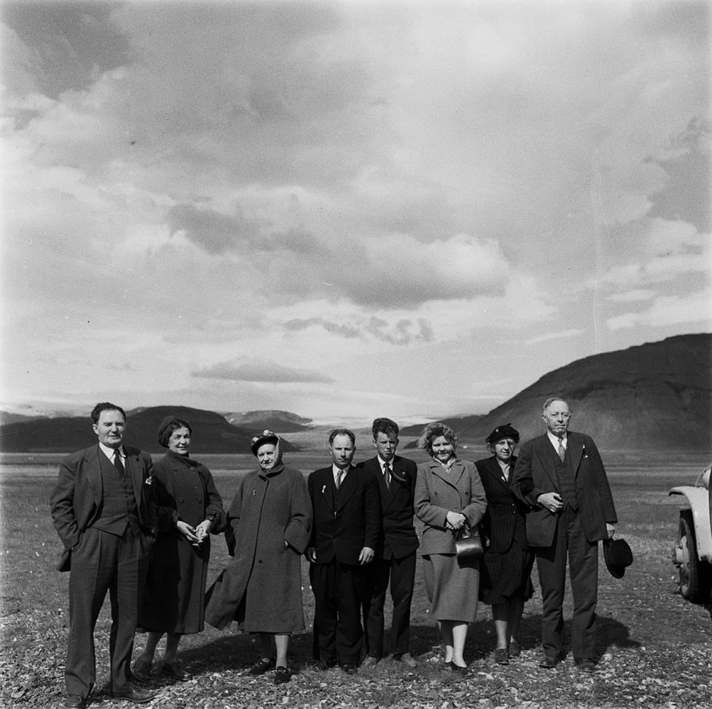 Uppstillt röð af ferðafólki prúðbúnu. Hermann Jónasson forsætisráðherra, Bodil Bertrup, Vigdís Steingrímsdóttir, Páll Þorsteinsson alþingismaður, óþekktur, óþekkt, Hólmfríður Zoëga og Geir Zoëga vegamálastjóri.