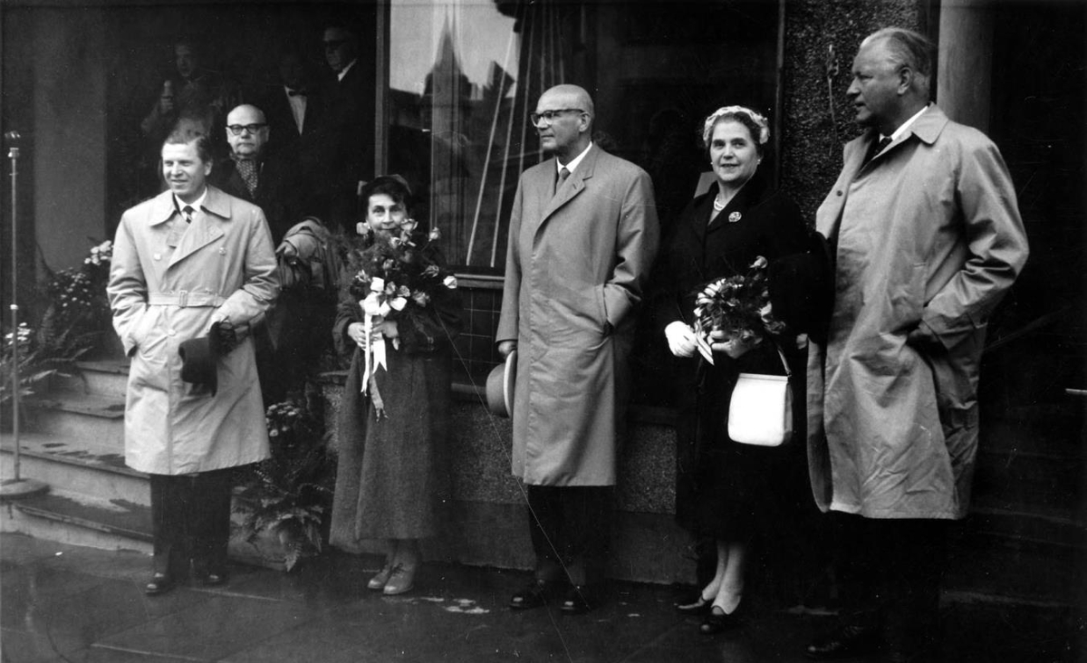 Opinber heimsókn á Akureyri, Magnús Guðjónsson bæjarstjóri tekur á móti Kekkonen forseti og Kekkonen forsetafrú Finnlands, ásamt Ásgeir Ásgeirsson forseta og Dóra Þórhallsdóttir forsetafrú.