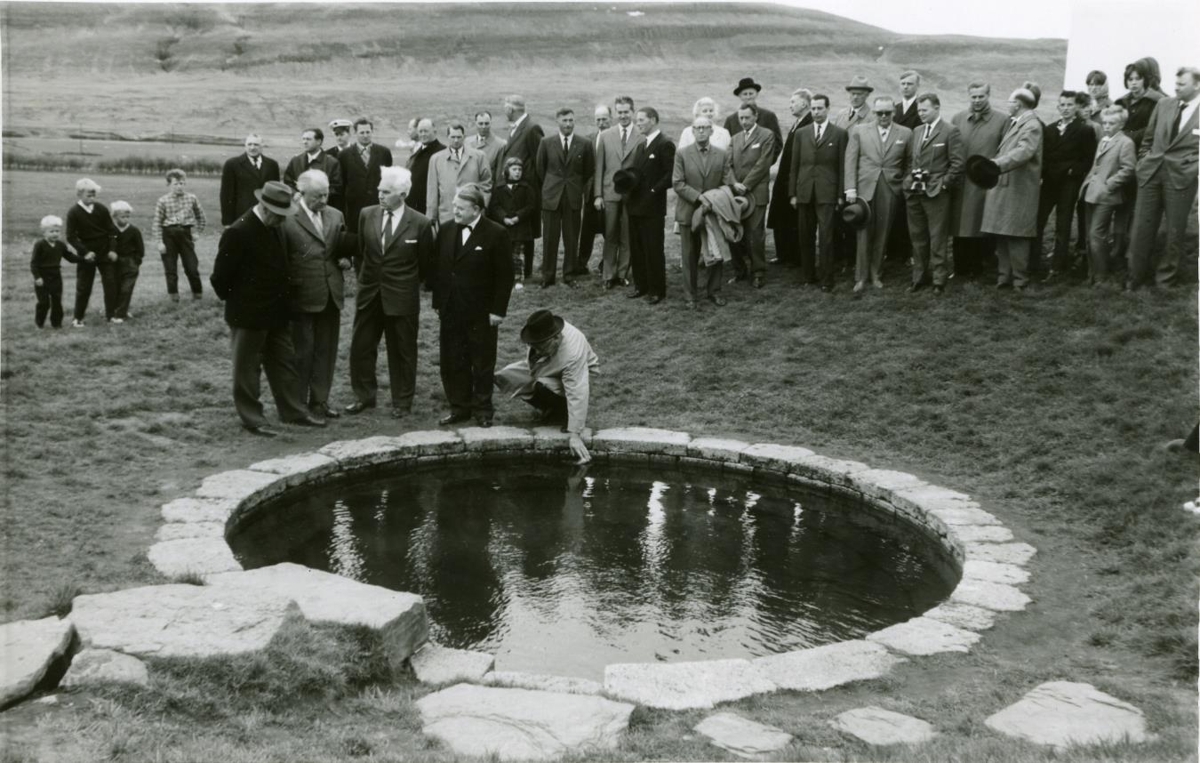 Ólafur V. konungur og Ásgeir Ásgeirsson forseti ásamt fylgdarliði og heimamönnum við Snorralaug í Reykholti. Matthías Jóhannesen blaðamaður yst t.h.