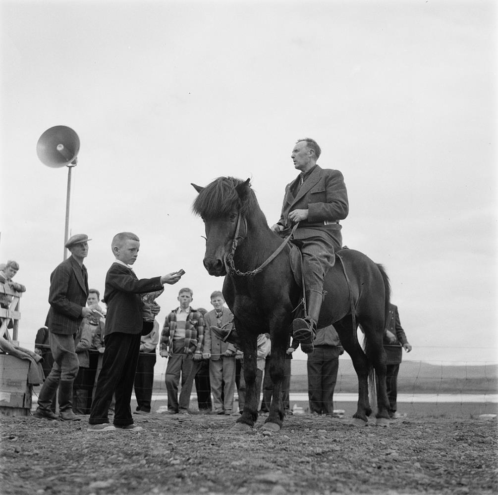 Faxaborg. Ferjukot. Borgarhreppur. Maður á hesti. Drengur stendur framan við hestinn eins og hann sé að fara að klappa honum eða gefa eitthvað. Fleiri börn standa hjá. Ari Guðmundsson á Skugga 201. Hestamannamót hestamannafélagsins Faxa. 1953. Heimildamaður Árni Guðmundsson frá Beigalda.