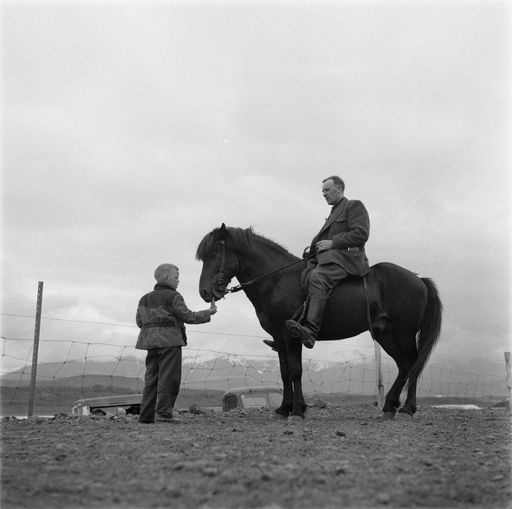 Faxaborg. Ferjukot. Borgarhreppur. Maður á hesti. Drengur stendur framan við hestinn eins og hann sé að fara að klappa honum eða gefa eitthvað. Hestamannamót hestamannafélagsins Faxa. Ari Guðmundsson í Borgarnesi á Skugga. 1953. Heimildamaður Árni Guðmundsson frá Beigalda.