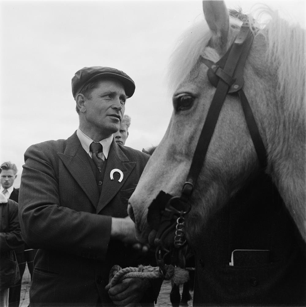 Faxaborg. Ferjukot. Borgarhreppur. Maður með skeifu í jakkaboðunig og derhúfu við hest. Marinó Jakobsson Skáney vinningshafi Faxaskeifunnar og hesturinn Glaður. Hestamannamót hestamannafélagsins Faxa. 1953. Heimildamaður Árni Guðmundsson frá Beigalda.