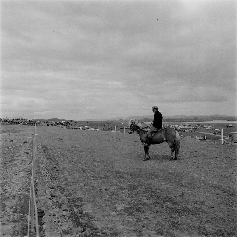 Faxaborg. Ferjukot. Borgarhreppur. Maður á hesti á reiðvelli. Magnús Sigurðsson Arnþórsholti á happdrættishesti Hestamannafélagsins Faxa. Hestamannamót hestamannafélagsins Faxa. 1953. Heimildamaður Árni Guðmundsson frá Beigalda.