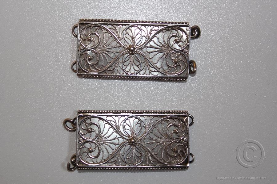 Tveir hlutar úr stokkabelti sem Madama Petrína Soffía Hjörleifsdóttir átti og notaði við skautbúninginn sinn. Beltið er í eigu ættingja hennar. Skautbúningurinn er á sýningu hér á safninu. Stærð hlutanna er 5,7 x 2,7 cm.