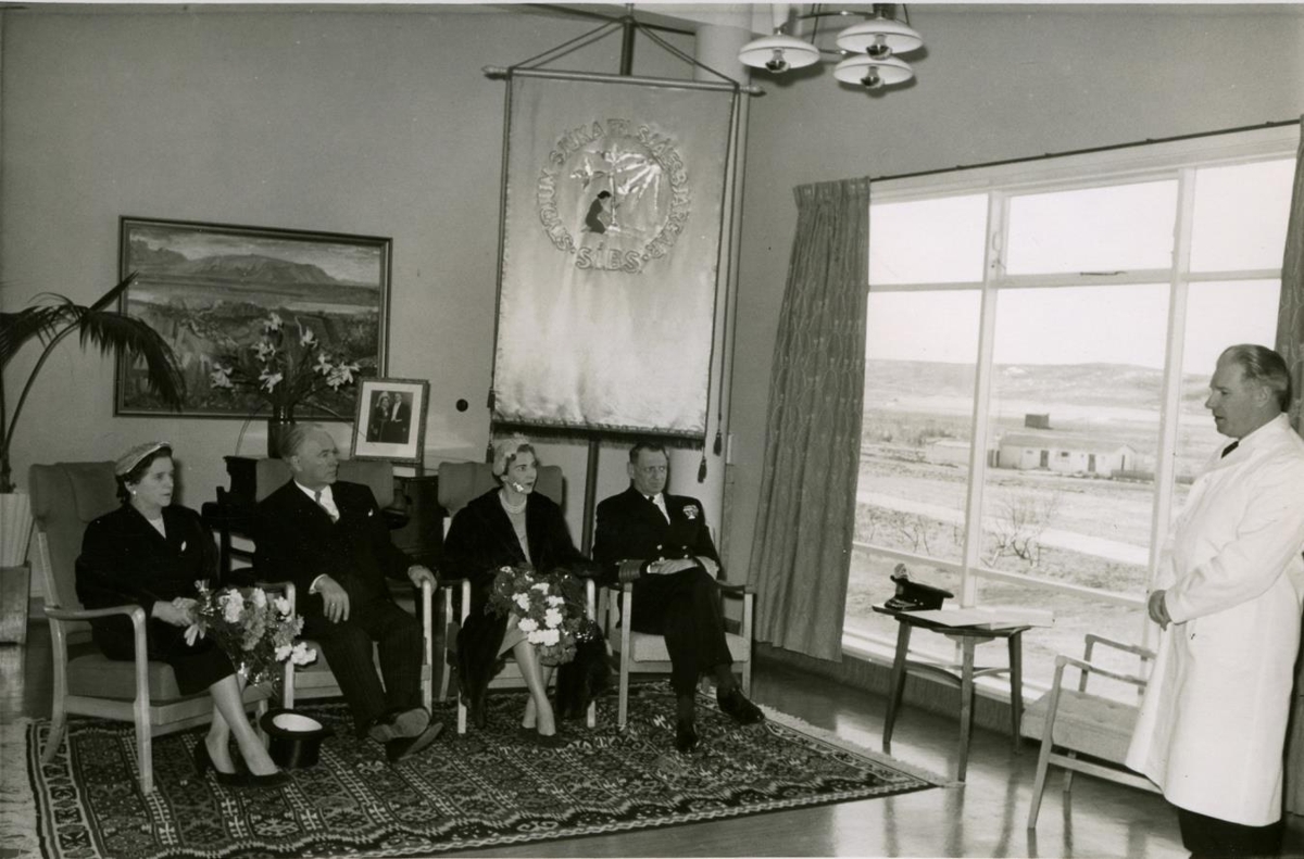 Konungshjónin dönsku í heimsókn hjá vinnuheimili SÍBS á Reykjalundi í Mosfellssveit. Oddur Ólafsson yfirlæknir kynnir starfsemina á Reykjalundi fyrir gestunum.