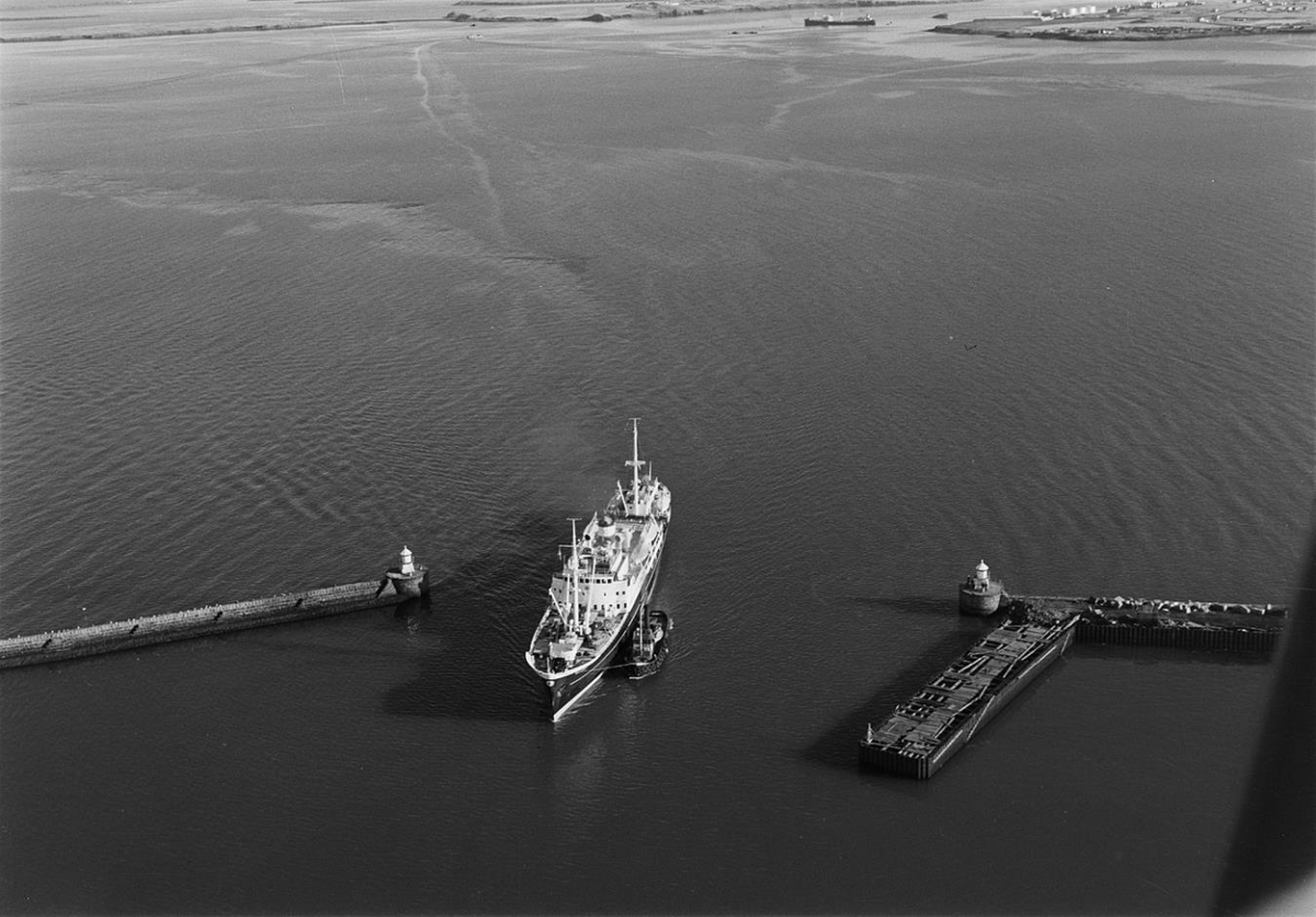 Reykjavíkurhöfn. Farþegaskip að sigla inn á milli hafnargarða. Hafnsögubátur fylgir skipinu.