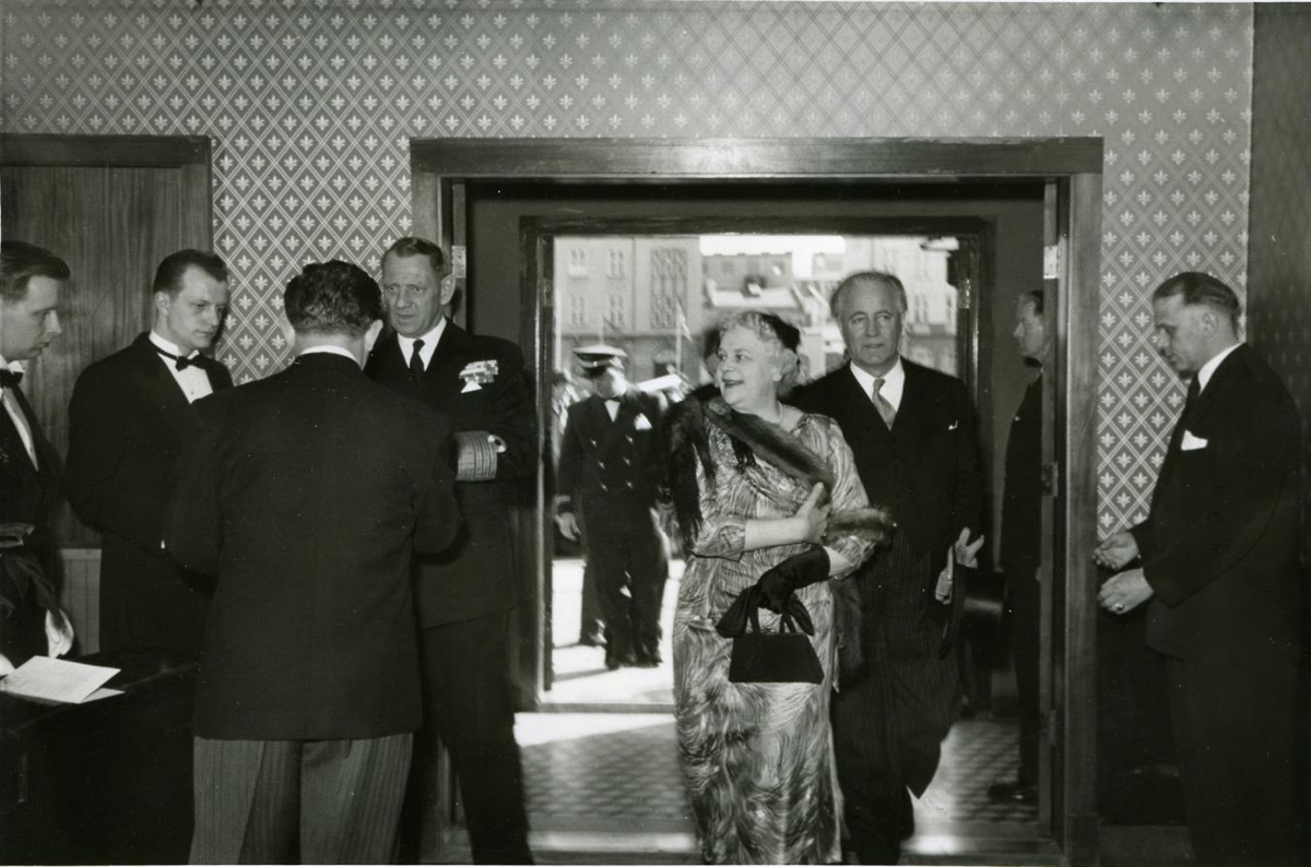 Konungshjónin dönsku ásamt forsetahjónunum og gestum í hádegisverði í Sjálfstæðishúsinu við Austurvöll. Friðrik IX. konungur t.v. og Ásgeir Ásgeirsson forseti t.h. að ganga í salinn ásamt Ingibjörgu Thors forsætisráðherrafrú.