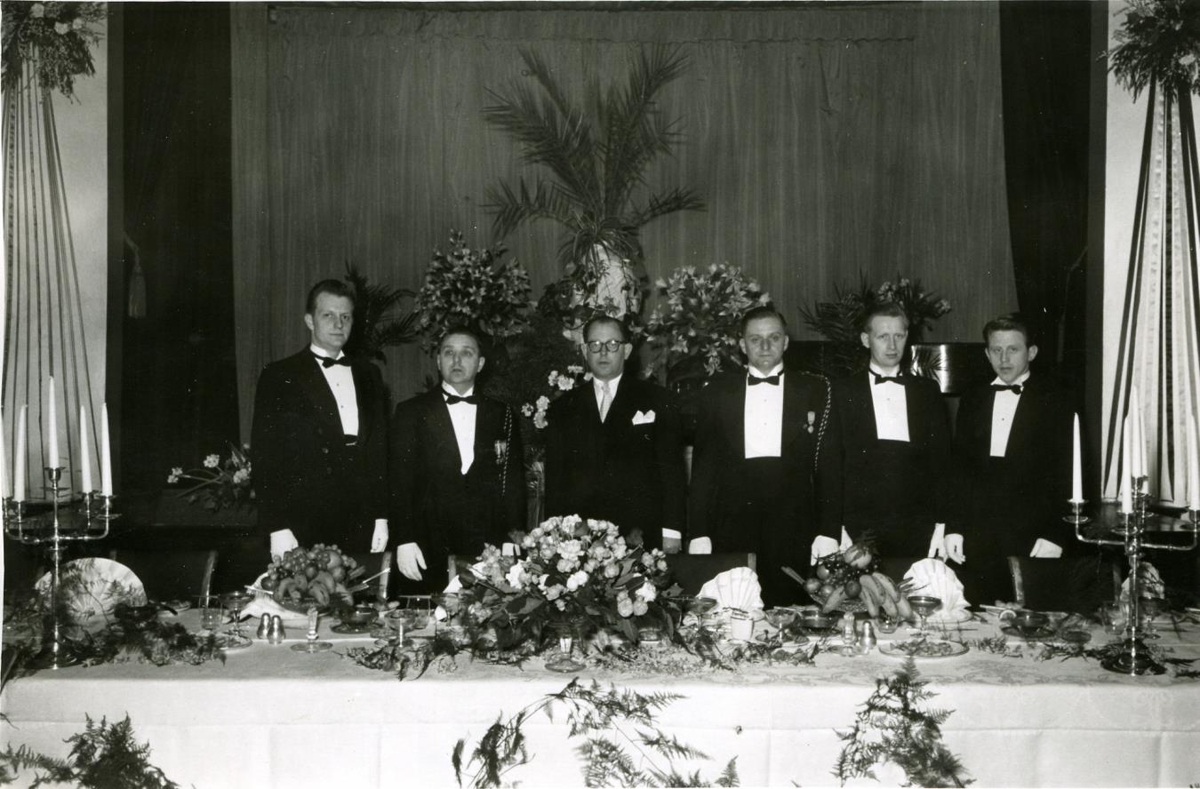 Konungshjónin dönsku ásamt forsetahjónunum og gestum í hádegisverði í Sjálfstæðishúsinu við Austurvöll. Þjónar og framreiðslumenn við veisluborðið fyrir komu gestanna.