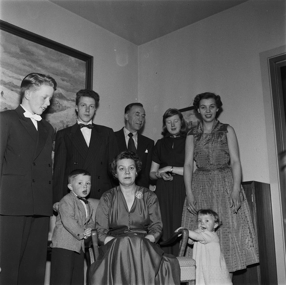 Fjölskylda Helga Péturssonar framkvæmdastjóra útflutningsdeildar SÍS og Soffíu Björnsdóttur á Smáragötu. Hjón með ungt par, tvö börn og barnabörn í stofu.