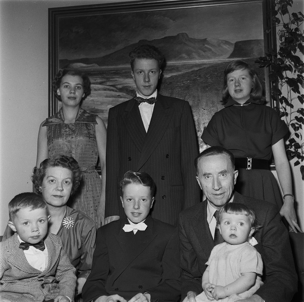 Fjölskylda Helga Péturssonar framkvæmdastjóra útflutningsdeildar SÍS og Soffíu Björnsdóttur á Smáragötu. Hjón með ungt par, tvö börn og barnabörn í stofu.
