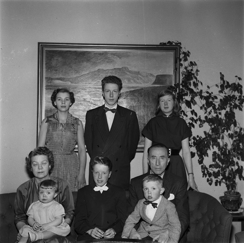 Fjölskylda Helga Péturssonar framkvæmdastjóra útflutningsdeildar SÍS og Soffíu Björnsdóttur á Smáragötu. Hjón með ungt par, tvö börn og barnabörn í stofu.