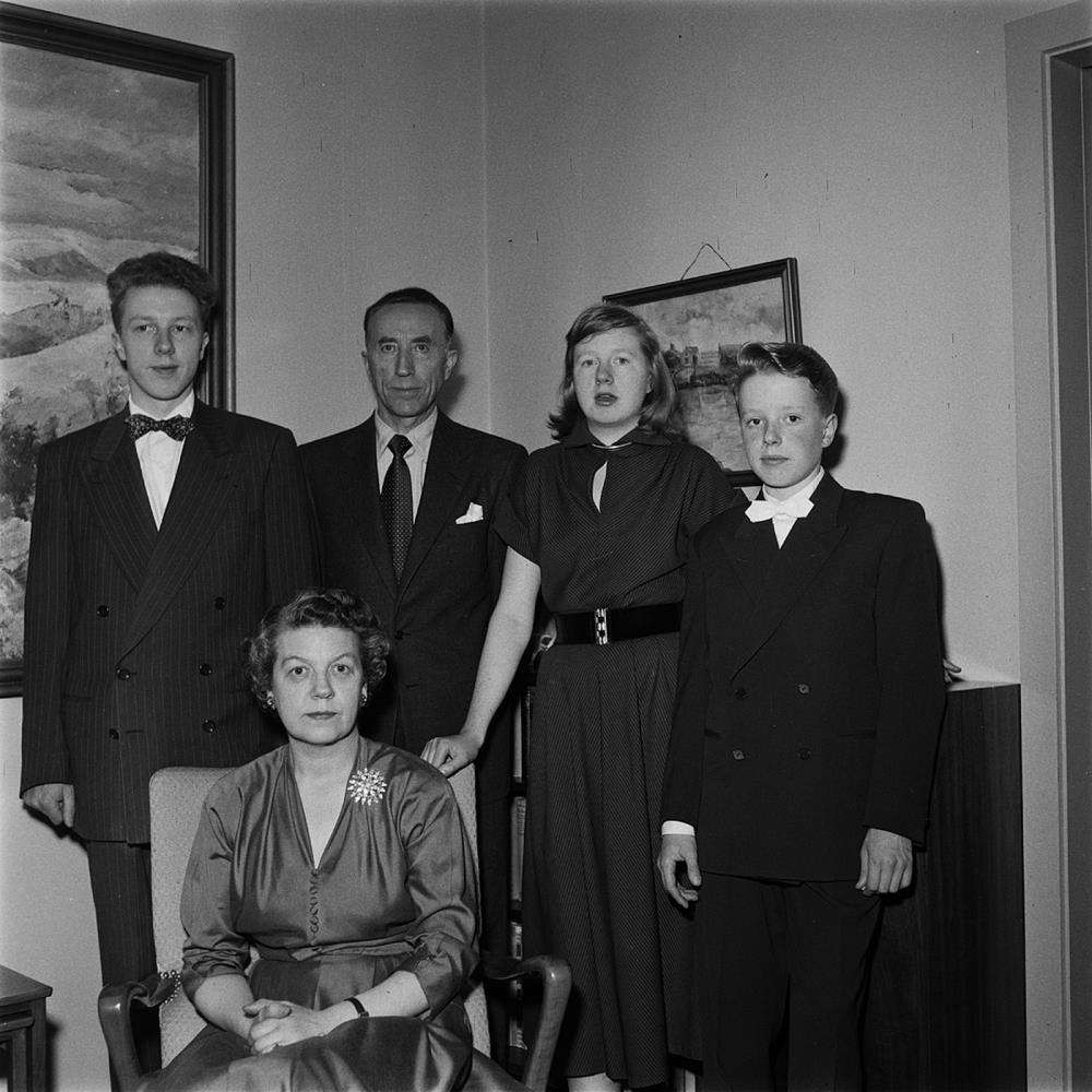 Fjölskylda Helga Péturssonar framkvæmdastjóra útflutningsdeildar SÍS og Soffíu Björnsdóttur á Smáragötu. Hjón með ungt par, tvö börn og barnabörn í stofu.