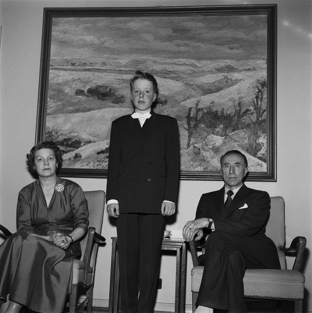 Fjölskylda Helga Péturssonar framkvæmdastjóra útflutningsdeildar SÍS og Soffíu Björnsdóttur á Smáragötu 11. Hjón sitja með fermingardreng standandi á milli sín. Málverk í baksýn.