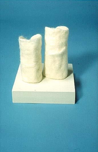 The Lookalikes seen here are made of white woollen fleece which Kristín acquired directly from a farmer and felted herself, having learned the technique from a book. Felting is an ancient method for using wool, but around 1980 felted wool was rarely seen in western art – although German artist Joseph Beuys was using raw wool in his works as early as the 1960s. The first impression is of a conventional abstract sculpture, leading to thoughts of ice and snow, or two figures in a blizzard. The different sizes of the forms, along with their relative placement, creates a tension which is intensified by the movement established by the crescendo of lines in the material. The pure white wool is also reminiscent of ancient marble sculptures, and the same is true of the pedestal beneath the figures. Simple moulded skeins of wool are here elevated on a pedestal like works of neoclassical art, and the piece is appropriate in the present time, under the banner of postmodernism.