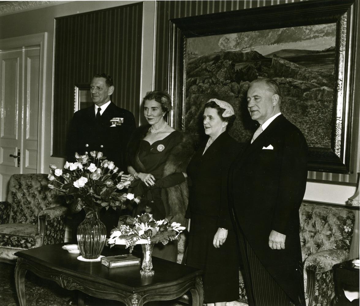 Konungshjónin dönsku ásamt forsetahjónunum í Ráðherrabústaðnum þar sem konungshjónin tóku á móti sendiherrum og sendifulltrúum erlendra ríkja hér á landi; f.v. Friðrik IX., Ingiríður drottning, Dóra Þórhallsdóttir og Ásgeir Ásgeirsson.