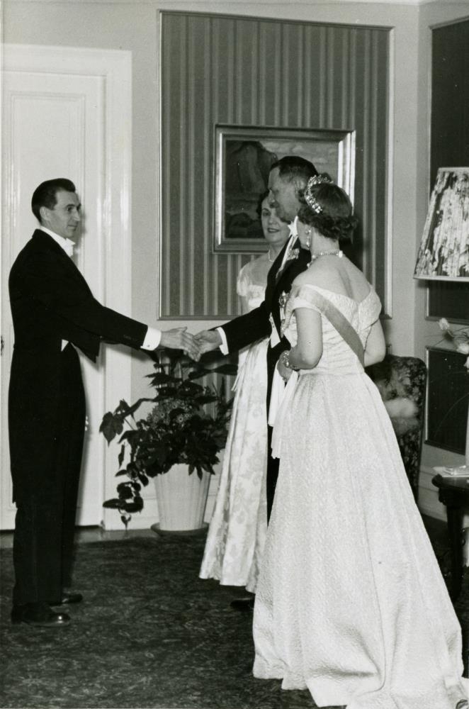 Konungshjónin dönsku ásamt forsetahjónunum í Ráðherrabústaðnum þar sem konungshjónin tóku á móti sendiherrum og sendifulltrúum erlendra ríkja hér á landi ásamt Bodil Bergtrup sendiherra.