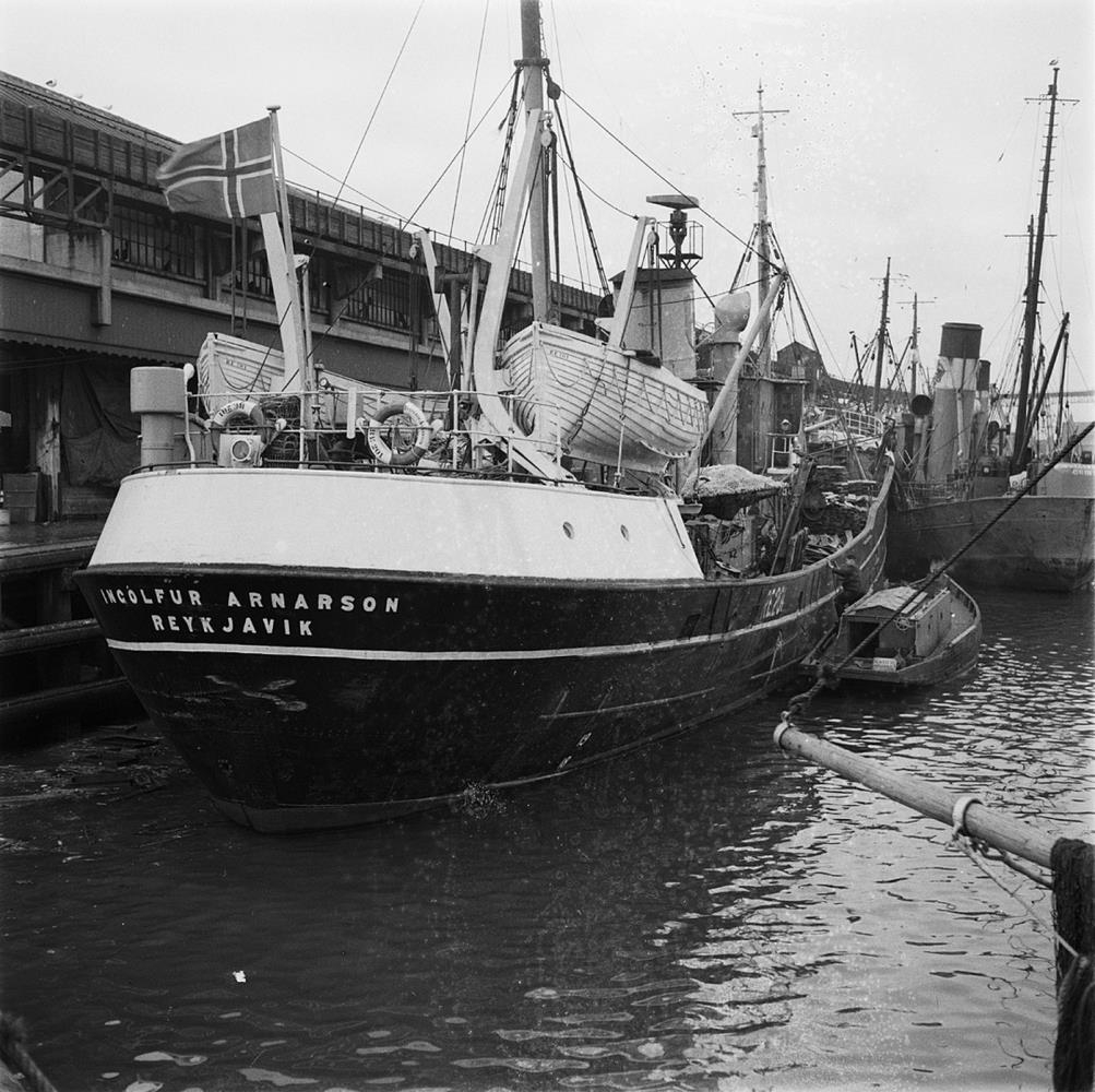Grimsby. Englandi. Togari við bryggju. Ingólfur Arnarson Reykjavík merkt á skut. Október 1953.