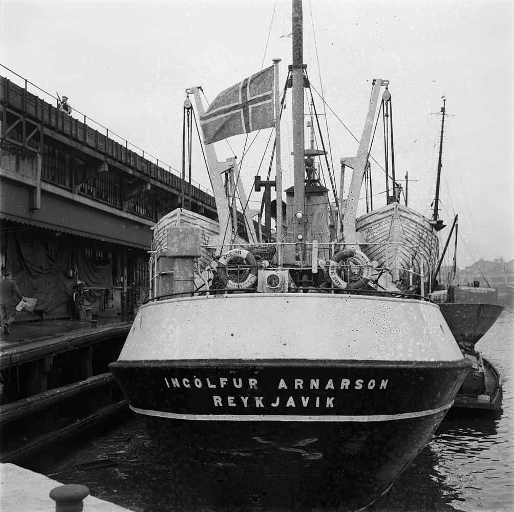Grimsby. Englandi. Togari við bryggju. Ingólfur Arnarson Reykjavík merkt á skut. Október 1953.