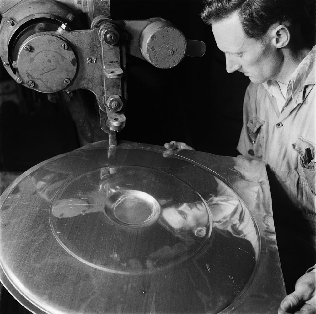 Rafha. Hafnarfirði. Maður að móta hringlaga plötu. Sennilega lok á þvottavélina Mjöll. Eyþór?
