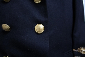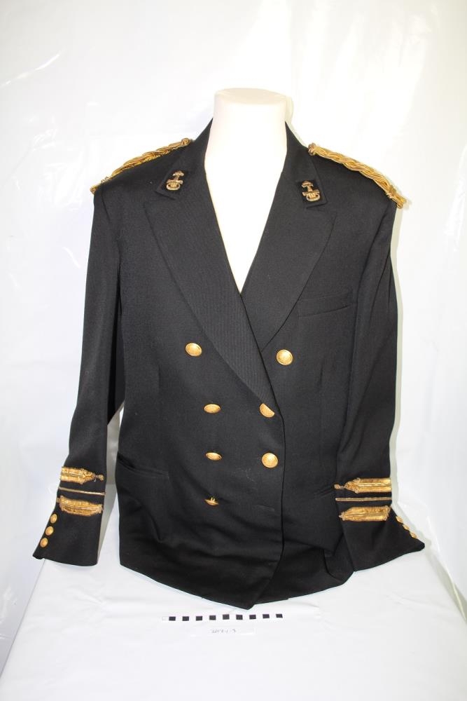 Jakki frá sýslumanni. Jakkinn er úr klæðisefni, fóðraður, tvíhnepptur með hefbundnum kraga, tveimur hliðarvösum og einum brjóstvasa. Einnig er brjóstvasi innan á jakkanum. Á jakkanum eru tvær raðir gylltra einkennishnappa, 2,4 sm í þvermál með skjaldamerki Íslands, fjórir í hverri röð og er jakkinn hnepptur á þrjá þeirra. Á ermunum eru gylltir einkennishnappar 1,6 sm í þvermál með skjaldarmerki Íslands, þrír á hvorri ermi. Í kragahornum jakkans er útsaumað merki sýslumanna.