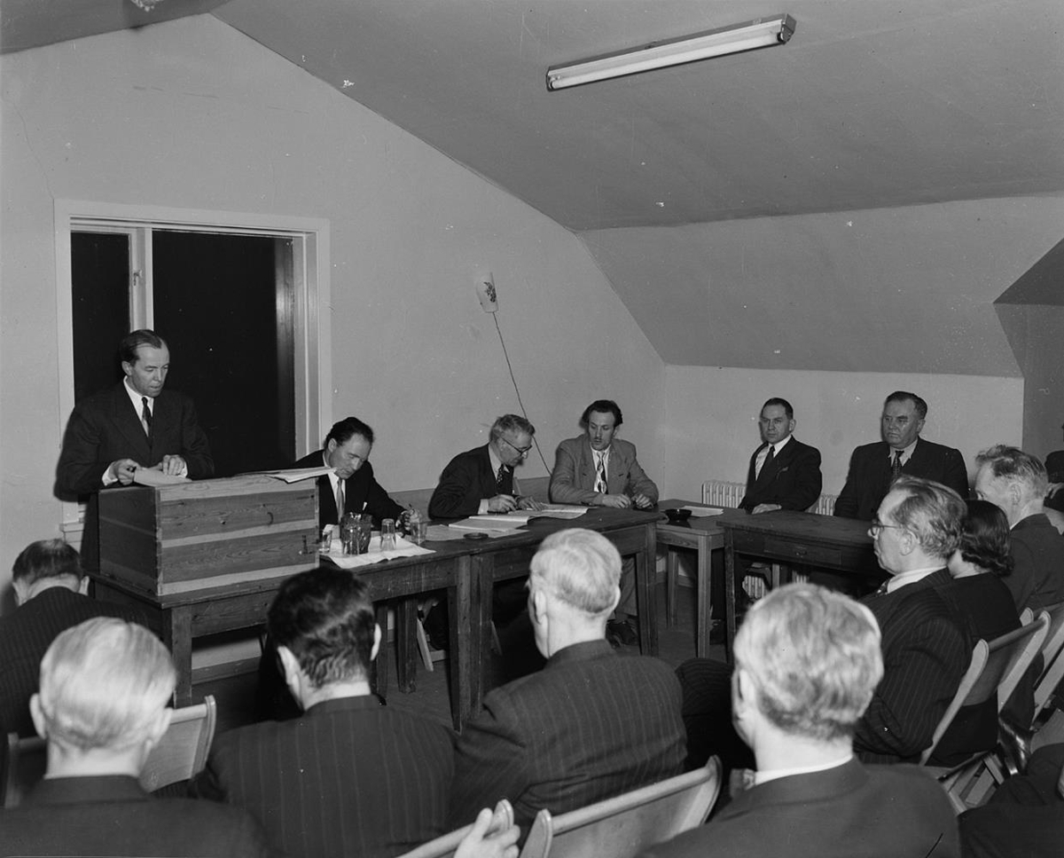 Fundur á vegum framsóknarmanna. Óþekktur maður í ræðustól. Síðan sitja Hermann Jónasson, Guðbrandur Magnússon. Þráinn Valdimarsson, Eysteinn Jónsson og Steingrímur Steinþórsson. Þekkja má baksvip Páls Zóphoíassonar og Rannvegiar Þorsteinsdóttur við hlið hans.