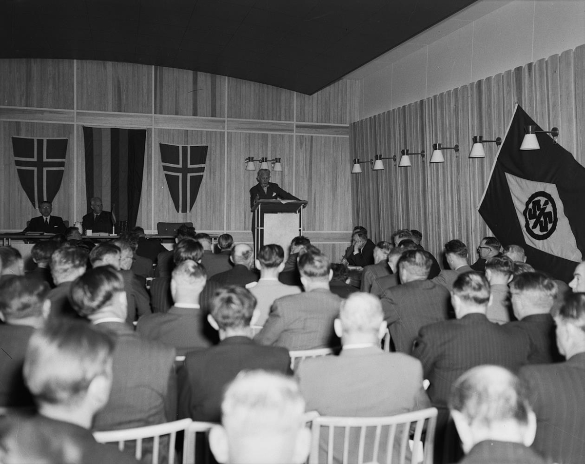 Fundur í samkomusal. Fáni SÍS og íslenski fáninn á veggjum. Maður í ræðustól. Vilhjálmur Þór heldur ræðu á fundi hjá Sambandi íslenskra samvinnufélaga.