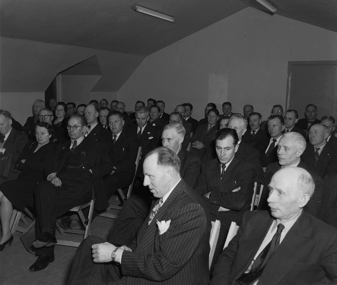 Fundur á vegum framsóknarmanna. Sér yfir hóp fundarmanna. Þar má þekkja Skúla Guðmundsson, Rannveigu Þorsteinsdóttur, Pál Zóphóníasson, Pálma Hannesson, Ólaf Jóhannesson, Daníel Ágústínusson og Ásgeir í Ásgarði.