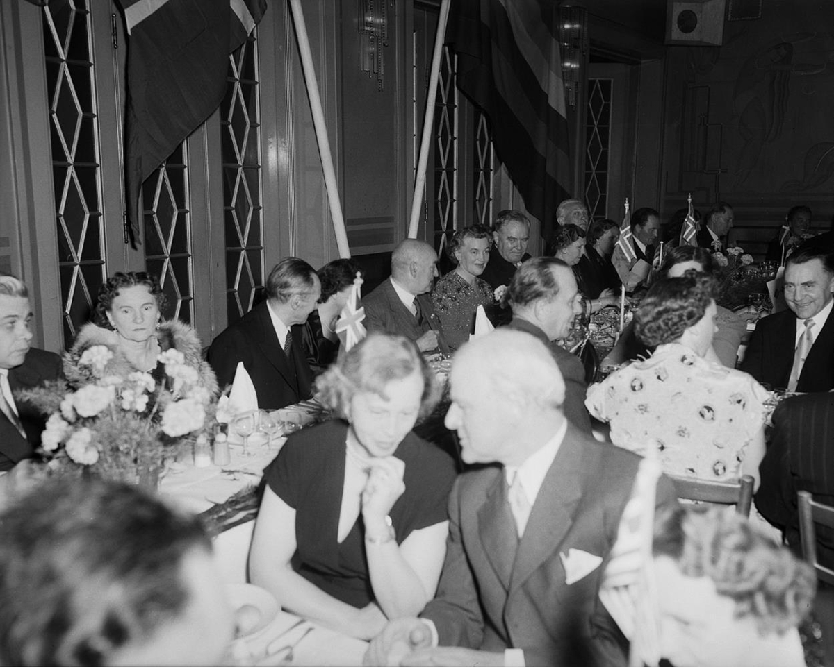 Hótel Borg. Veislugestir sitja við dúkuð borð. Þekkja má við háborðið: Bjarna Benediktsson, Vigdísi Steingrímsdóttur, Steingrím Steinþórsson, Guðlaugu Kvaran, Vilhjálm Þór og Hermann Jónasson. Opinber veisla.