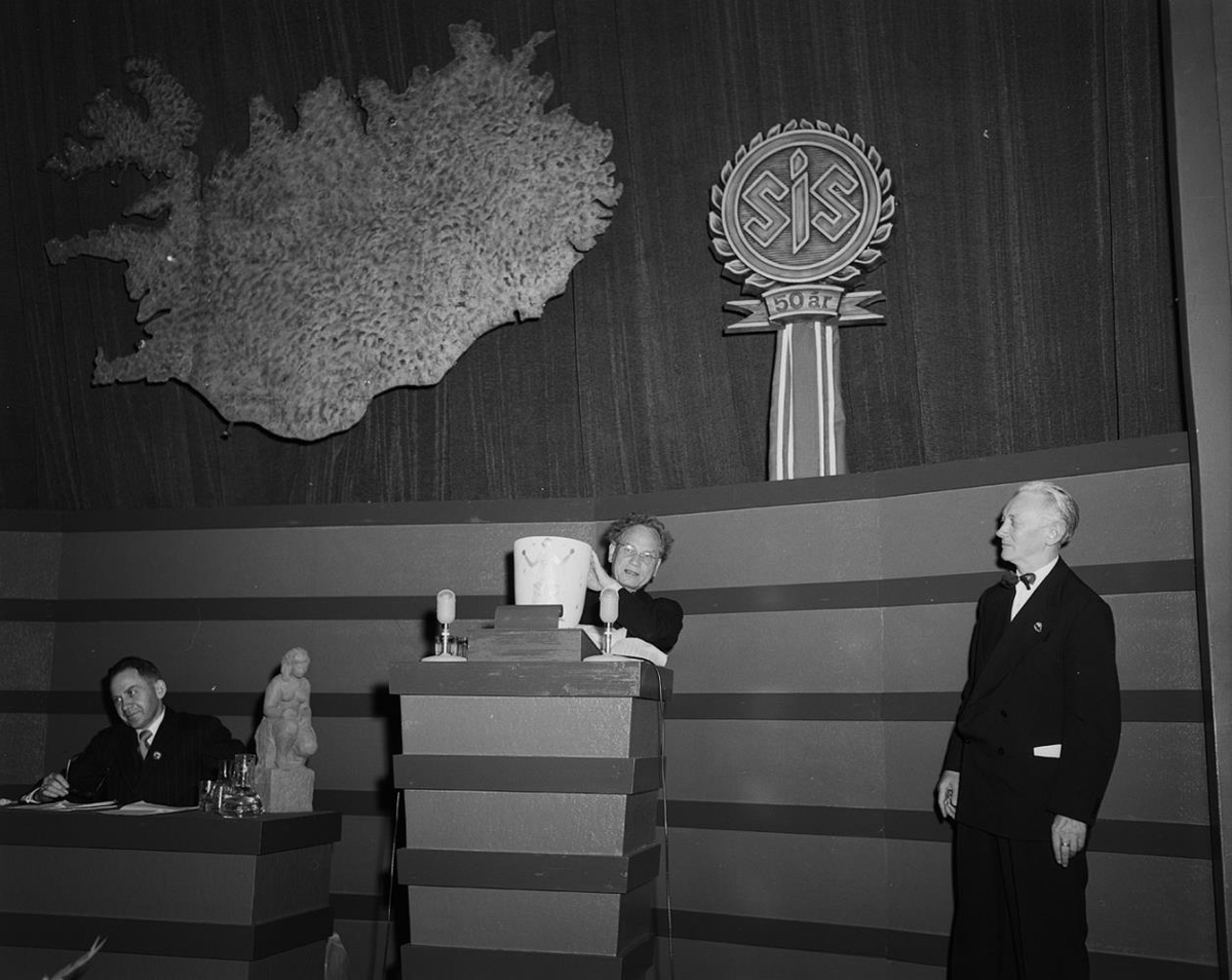 Tjarnarbíó. Reykjavík. Kona í ræðustól í samkomuhúsi, fundarstjóri situr við hlið hennar á einn veg en maður stendur við hlið hennar á hinn. Íslandskort á tjaldi, merki SÍS og 50 ár þar undir, fólk í sal. Eysteinn Jónsson fundarstjóri og Vilhjálmur Þór. Aðalfundur SÍS, Sambands íslenskra samvinnufélaga 1952, á 50 ára afmæli SÍS. Sjá Samvinnan 1.8.1952.
