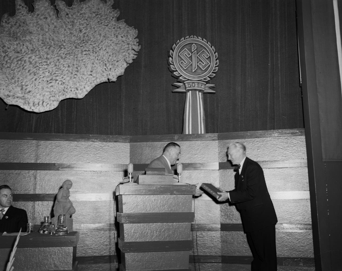 Tjarnarbíó. Reykjavík. Maður í ræðustól í samkomuhúsi að rétta öðrum manni bók, fundarstjóri situr til hliðar. Íslandskort á tjaldi, merki SÍS og 50 ár þar undir, fólk í sal. Vilhjálmur Þór tekur á móti gjöf, Eysteinn Jónsson fundarstjóri. Aðalfundur SÍS, Sambands íslenskra samvinnufélaga 1952, á 50 ára afmæli SÍS. Sjá Samvinnan 1.8.1952.