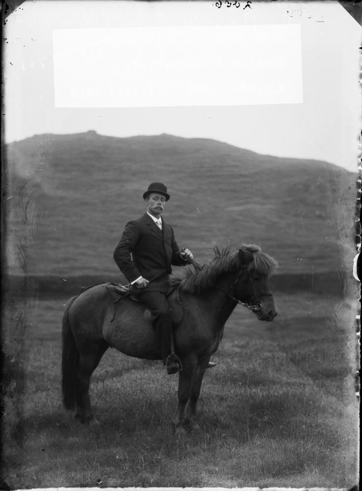 Maður með harðkúluhatt í jakkafötum situr á hesti. Hlaðinn veggur og hæð í bakgrunni. Benedikt var prestur í Bjarnarnesi þegar myndin var tekin.