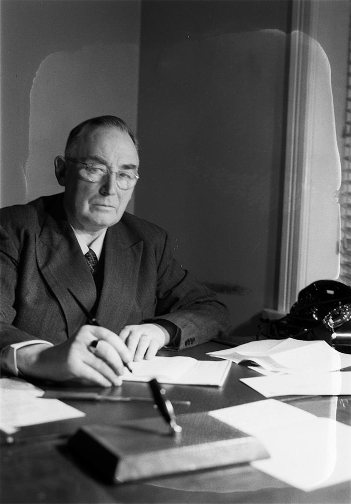 Maður situr við skrifborð með pappíra og pennastatíf. Sími á borði. Þorsteinn Jónsson kaupfélagsstjóri.