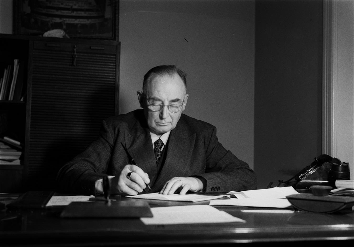 Maður situr við skrifborð og skrifar á blað. Sími á borði og blekpressa. Skápur að baki. Þorsteinn Jónsson kaupfélagsstjóri.