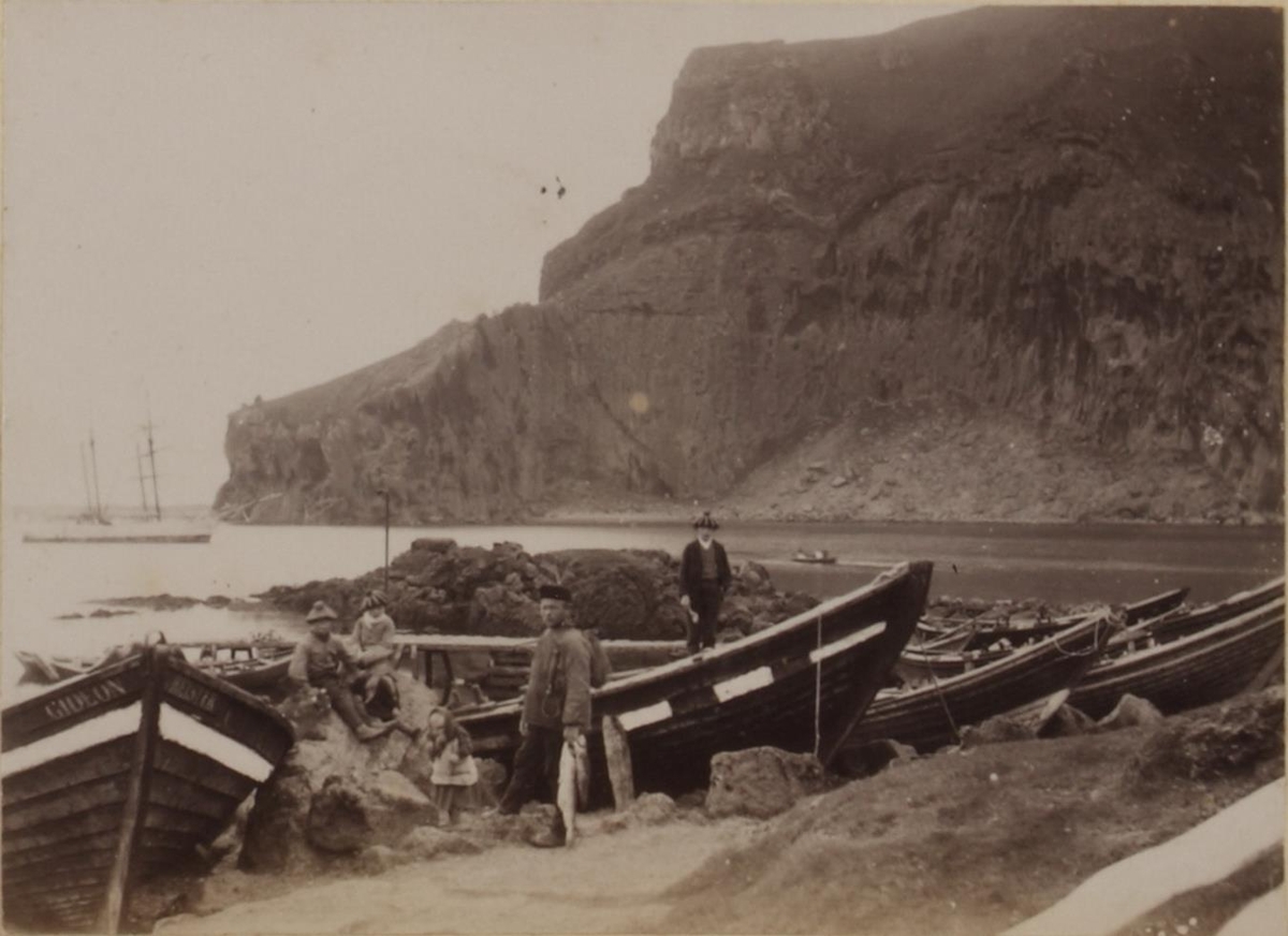 Vestmannaeyjar, Skansinn. Árabátar í fjörukambi. Á fremsta bátnum má lesa heitið „GIDEON REISTUR“, nokkur börn og unglingar við bátana. Seglskip á leguni og Heimaklettur í bakgrunni.