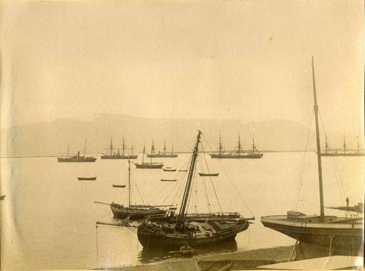 „Á myndinni má sjá skólaskipaflotadeild breska flotans. Hún kom hér 1893, 1896 og 1897. Aðeins í júlí 1896 mun hún hafa hitt Bothnia fyrir í höfninni í Reykjavík. Í flotadeildinni voru fjögur skip: Active og Volage, (með lotað stefni, til hægri á myndinni) og Champion og Calypso með afturhallandi stefni).“ „Liklega frá því er skólaskipadeild breska flotans kom í heimsókn í júlí 1893, (Active, Volage, Calypso og Ruby). Sama mynd og Lpr-486-a og 486-b.“ (BÞ 2017)