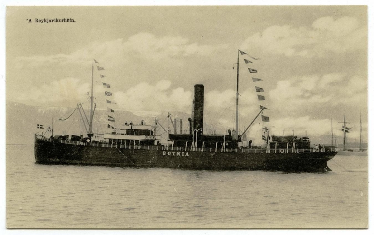„Botnía, hið langlífa millilandaskip DFDS.Það var smíðað 1891 og var í siglingum hingað með hléum 1892-1934. Myndin er líklega tekin 1910-15.“ (BÞ 2017)