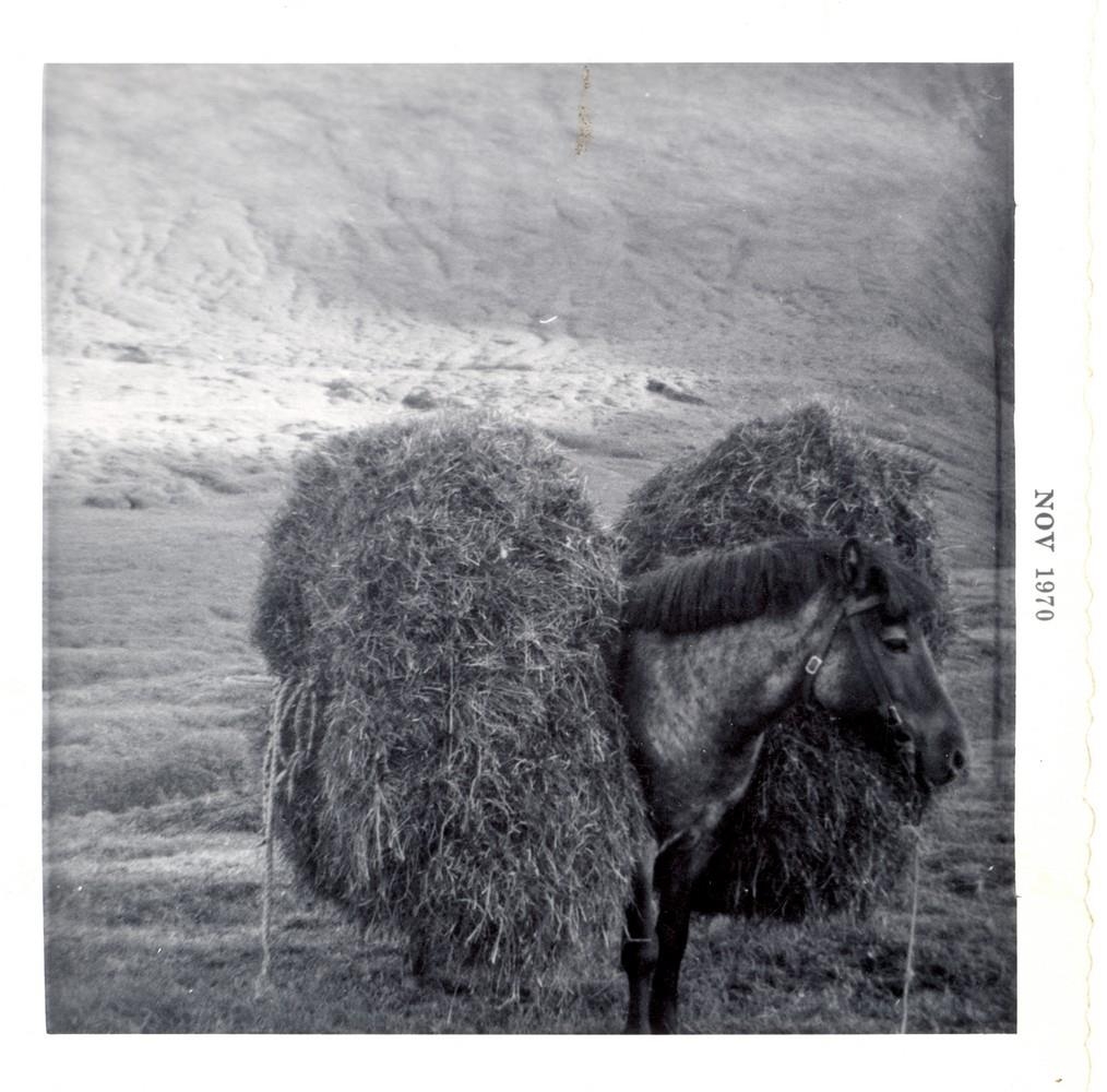 Mósa gamla með heybagga, bundið til sýnis fyrir hina ungu kynslóð.