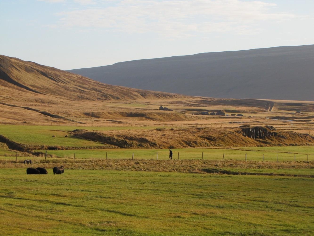 Tekið við Steinadal í Kollafirði á Ströndum. Grá kind með tvö lömb, bóndinn gengur eftir gamla veginum, klettaholt sem heitir Birgisholt á túninu. Bærinn í baksýn er Ljúfustaðir.