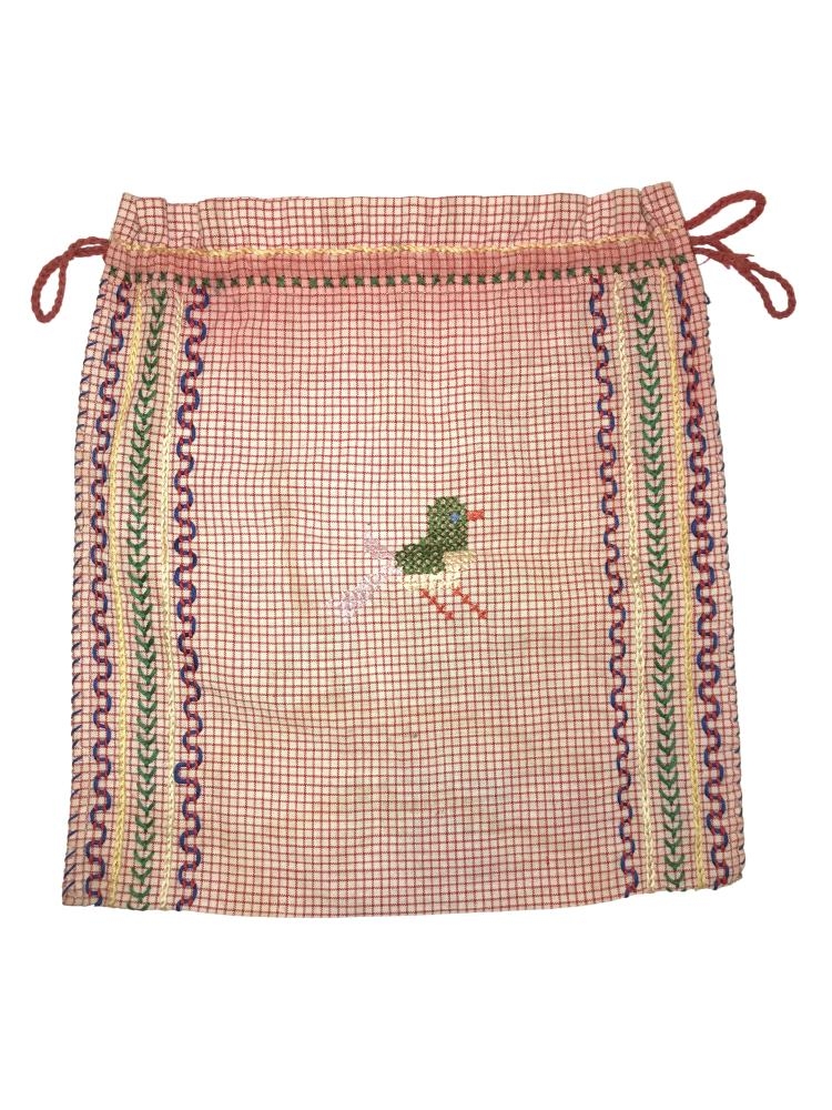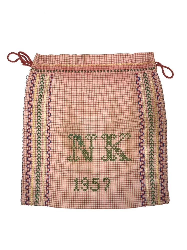 Handavinnupoki saumaður í 9 ára bekk 1956-1957. Pokinn er allur handsaumaður. Hann er skreyttur útsaumslínum meðfram hvorri hlið. Að framan eru stafirnir NK og ártalið 1957, saumað með krosssaumi. Að aftan er útsaumsmynd (fugl) saumuð með krosssaumi. Pokinn er dreginn saman að ofan með heklaðri snúru. Stærð: 30 x 27.5 sm.
