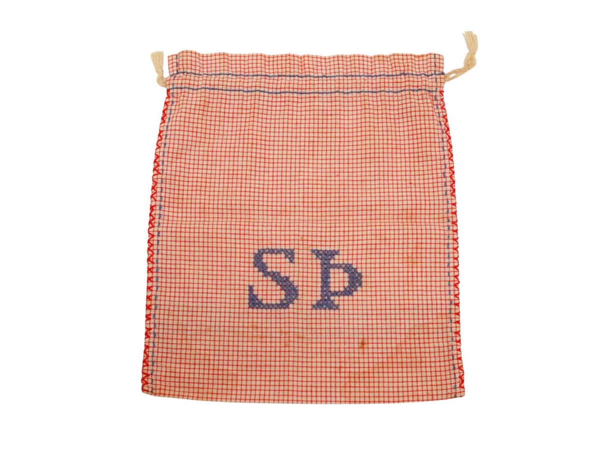 Handavinnupoki saumaður í 9 ára bekk í Melaskóla 1965-1966. Pokinn er allur handsaumaður. Að framan eru stafirnir SÞ saumaðir með krosssaumi. Að aftan er pokinn skreyttur útsaumslínum sem mynda láréttan munsturbekk neðarlega á pokanum. Útsaumsspor: Leggsaumur (kontorstingur, varpleggur), greinaspor, oddaspor og ídregið þræðispor. Að ofan er brotinn breiður faldur á rönguna. Saumaður er afturstingur í gegnum faldinn til að búa til rennu fyrir snúru. Pokinn er dreginn saman með snúrunni. Stærð 31.5 x 26.5 sm. Skyldustykki samkvæmt námskrá grunnskóla frá 1960.