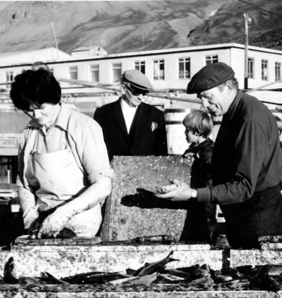 Síldarsöltun á Ólafsfirði. Síldarstúlka, Magnús Gamalíusson útgerðarmaður og Jón Steinsson fiskmatsmaður og verkstjóri.