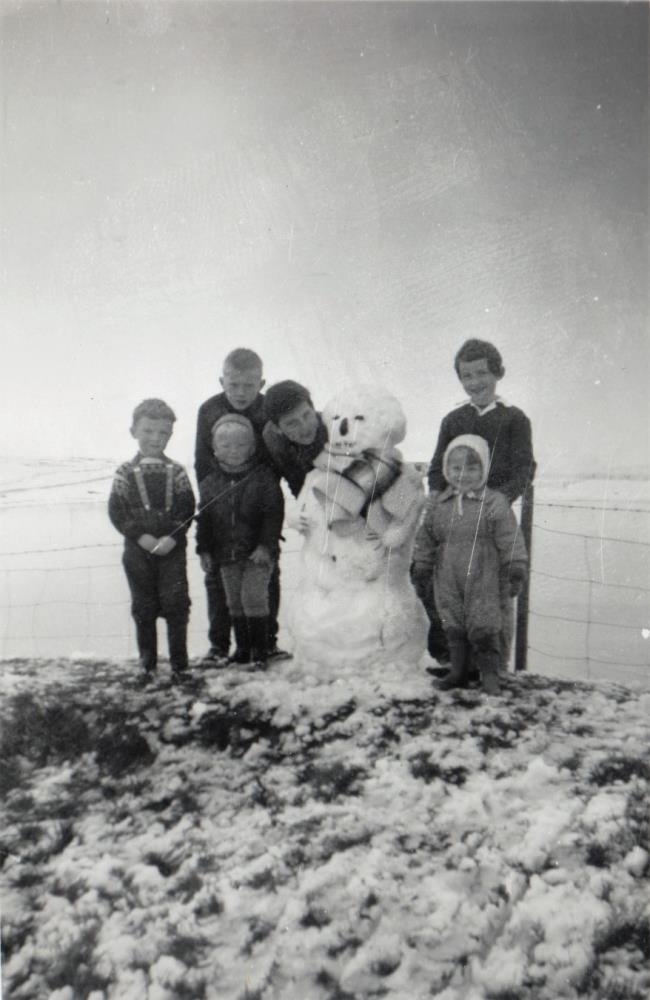 6 börn stilla sér upp með nýbyggðum snjókarli.