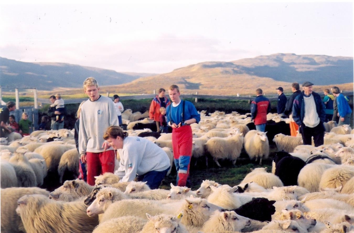 Réttað í Skarðsrétt árið 2002. Hafþór Óskarsson, Sandra Rún Björnsdóttir, Sverrir Guðbrandsson, Ólafur Tryggvason og fyrir aftan til hægri Bjarni Guðmundsson í Bæ.