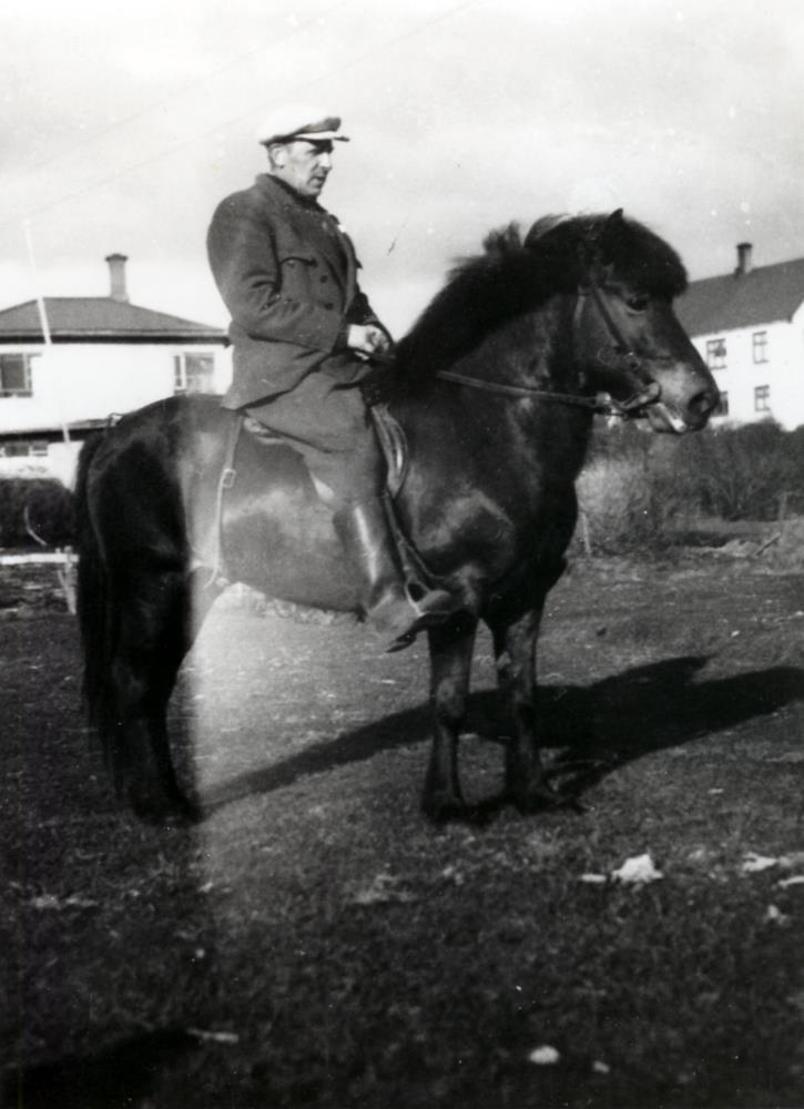 Ari Guðmundsson á hestinum Skugga við gömlu sundlaugina í Borgarnesi.