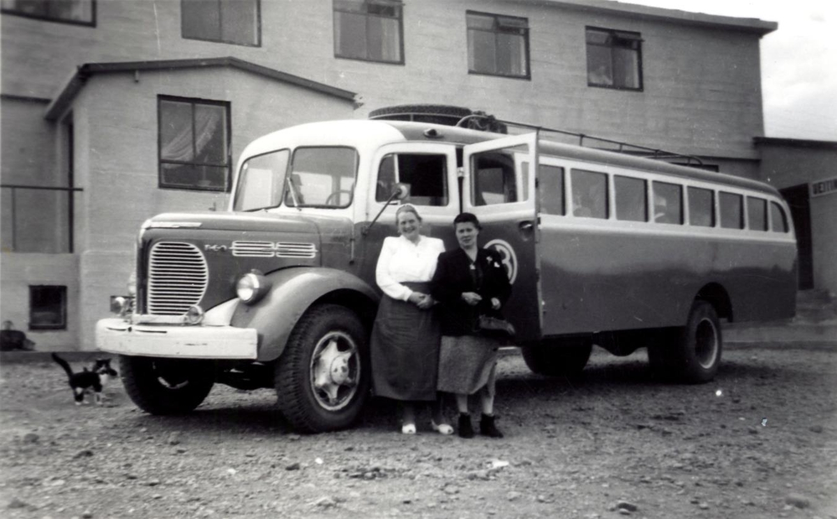 Ólöf og Geirlaug stilla sér upp fyrir framan rútu Sæmundar Sigmundssonar, í kvenfélagsferð.