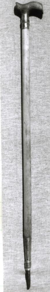 Koparskjöldur á handfangi merktur K.M., koparhólkur að neðan og einnig langur járnbroddur.