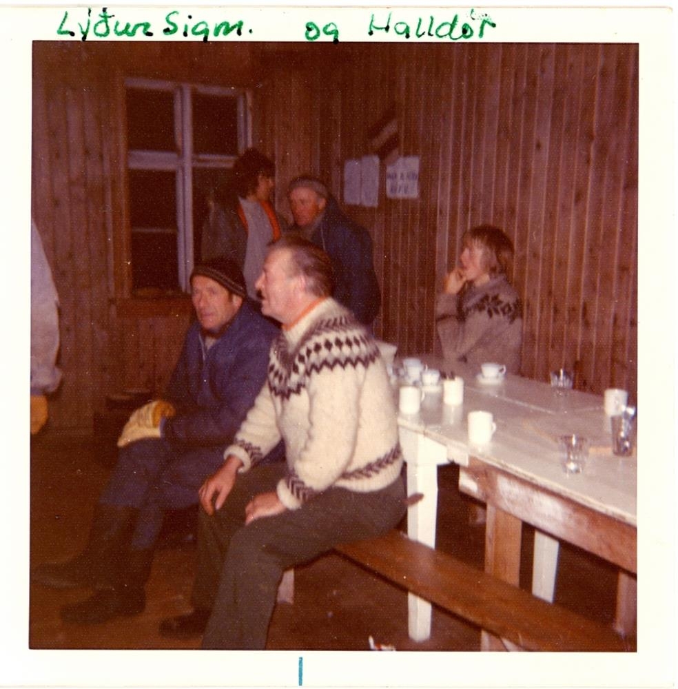 Lýður Sigmundsson og Halldór Jónsson sitja fremstir, Jón Sigmundsson á Gili stendur hjá, Sigmundur Jónsson á Gili situr svo hinu megin við borðið.
