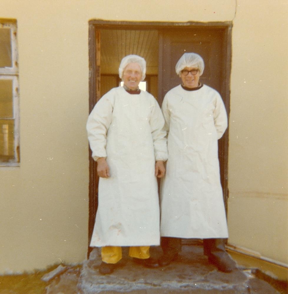 Jón Sigmundsson og Einar Magnússon í sláturhúsgallanum.